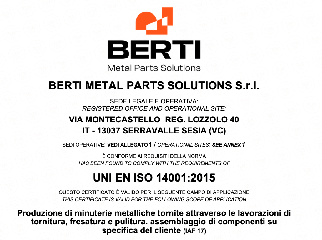 BERTI Metal Parts Solutions Certified UNI EN ISO 14001